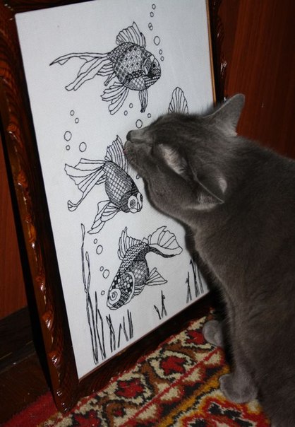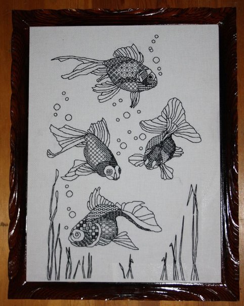так же по заказу любимого мужа и с совместником вышились такие рыбки, хотя с недоверием смотрела на схемку, думала что блэкворк не мое и отправится она потом в ящичек с долгостроями.