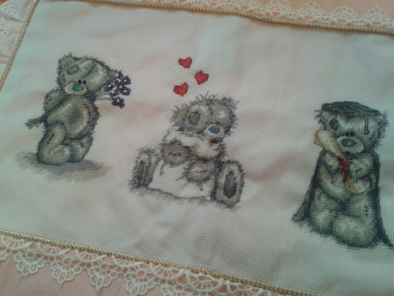 Вышивка крестомПошилась вот такая "одежка" для подушки.Вышивала на заказ,для своей больничной подружки.Вот уж не думала,что Теддики такие трудные))Я конечно бэк уважаю,но тут просто мучения были с ним.И все равно мне понравилось.
