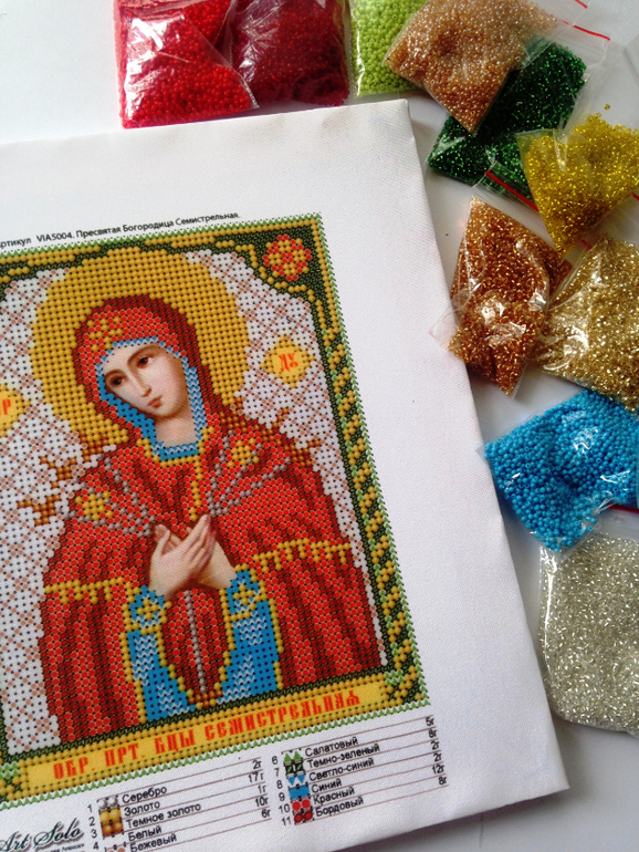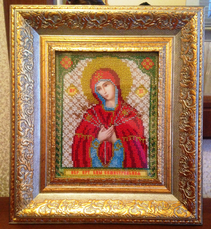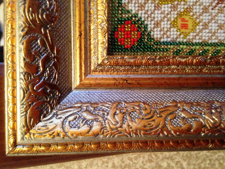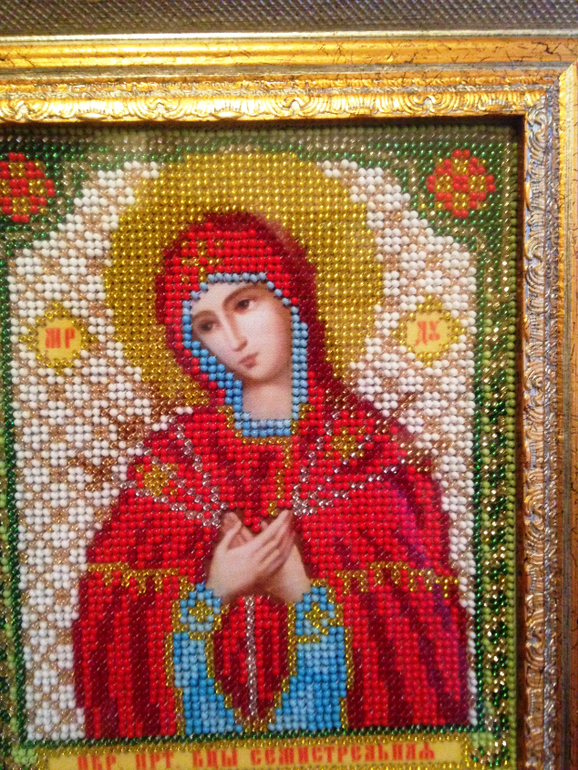 Инна, красота, очень кропотливая это работа — вышивка бисером! У меня сейчас дочь вышивает икону. Вы не могли бы в личку написать технику вышивания? Именно вашу, как приспособились? Как нитку вставляли (она очень маленькая иголочка), какие нитки использовали, у нас капрон и постоянно спутывается. В общем вышили только три рядочка и так нам трудно кажется))) Спасибо заранее))))