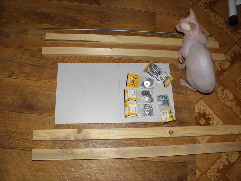 Потом мы съездили в строительный магазин, прикупили необходимое, а это всего то 2 бруска 40*40, еще 2 бруска 40*20, штырь нарезной (не нашел болты нужной длины при заданной ширине, и поэтому решил пилить этот штырь самостоятельно), по 2 пакета барашков и шайб, и болты. Доска для основания у нас была. Итак, это то, что было изначально: (без кота тут никак, ведь принесли что-то новенькое, что он еще не видел)