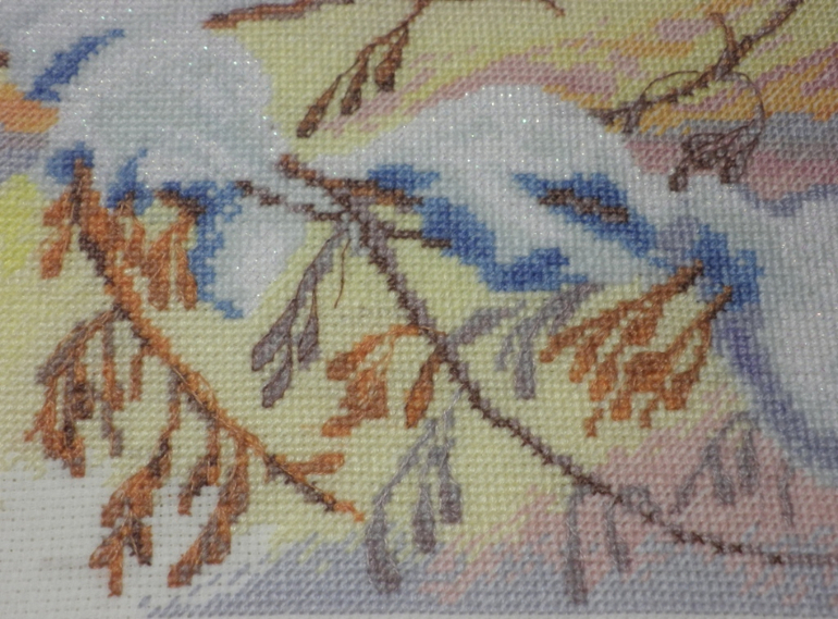 Снежок блестит за счёт того,что белый цвет вышивается блендом с крейником, смотрится ненавязчиво и очень реалистично,как настоящий снег в солнечных лучах!
