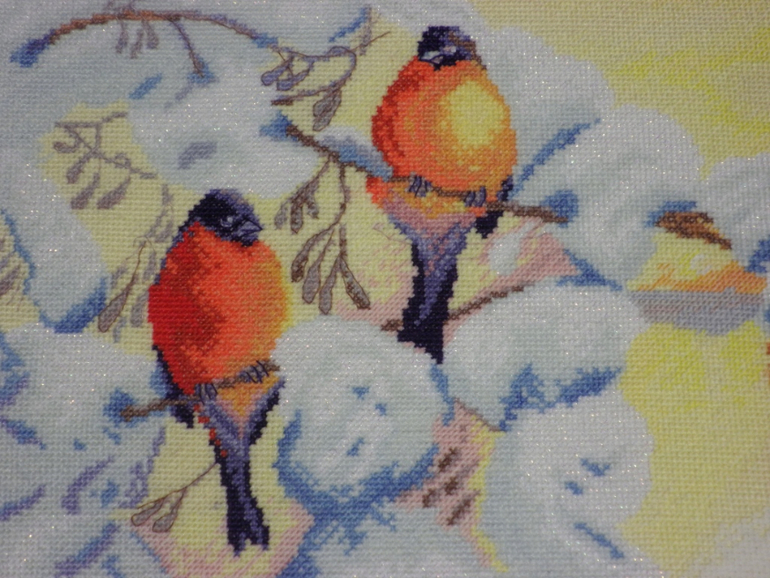 какой снееееег. живой прям.себе бы не вышила — вопрос куда повесить) только если на дачу. да и зимы 9тимесячной хватает. но классссс!пузатики-снегири, цвета фона такие нежные, как днём в лесу.... ух)бэка много лишнего на мой взгляд. можно веточки и попроще сделать)