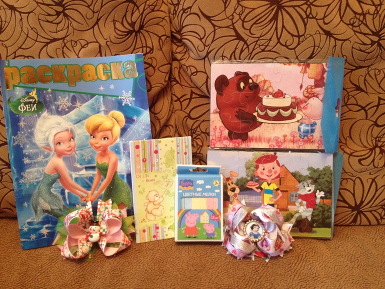 А это для Варюшки:и раскраска,и паззлы,и блокнотик,который уже разрисовывается,и мелки,и очень классные заколочки.