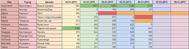 Напоминалка: сперва складываем проценты за канву и за цвет, а потом количество вышитых за день крестиков умножаем на эти проценты