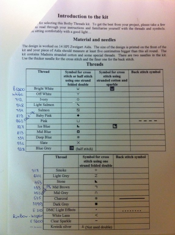 Первый столбец — название цвета, второй — символы для крестиков или полукрестиков (там где в скобочках half stitch написано), используя одну нитку, сложенную вдвое (это дословно ))), вот про третий я не очень поняла, там крестик вышивается, мулине и то ли металликом (переводится как блеск...), а четвертый — это бэк. И в последней строчке написано, что Крейник вдвое складывать не надо.