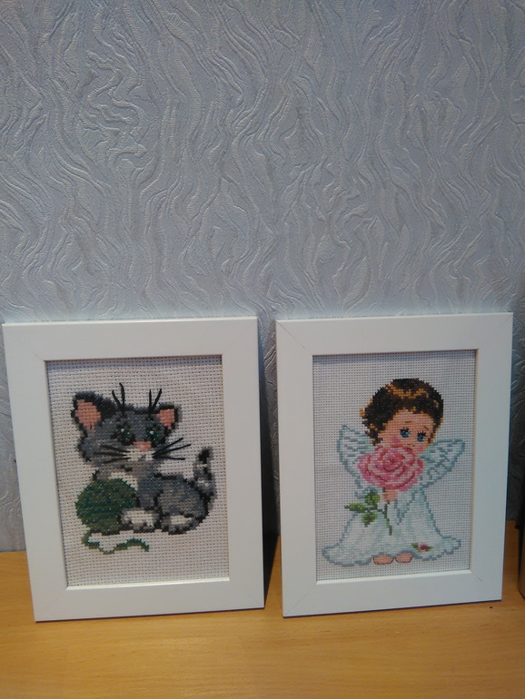 1.Вставила в рамы некоторые работы,теперь хоть не в тумбочке валяются.