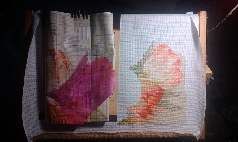 времени мало, у ребенка тренировки допоздна — вышиваю на руках — в другом совместнике - подушку. а поскольку тюльпаны на станке — остается только урывками прибавлять (((