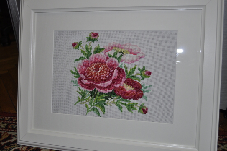 Работа хорошая и оформление тоже, поздравляю с первой большой работой !Мне кажется подошло бы двойное паспарту( вниз узкое в тон цветов например розовое или бордовое а поверх белое широкое) ну это моё мнение, я люблю двойные паспартушки и вышивка зайграет выразительней !