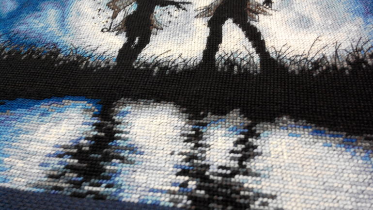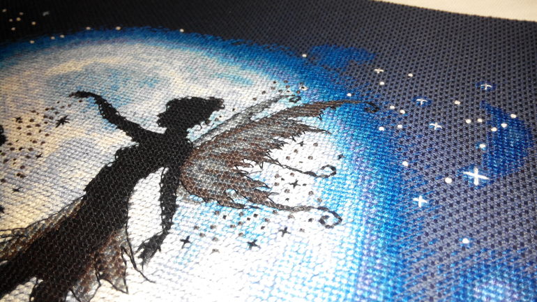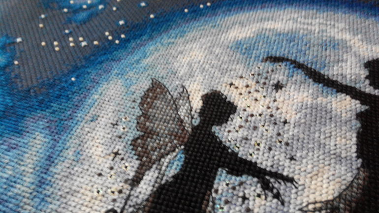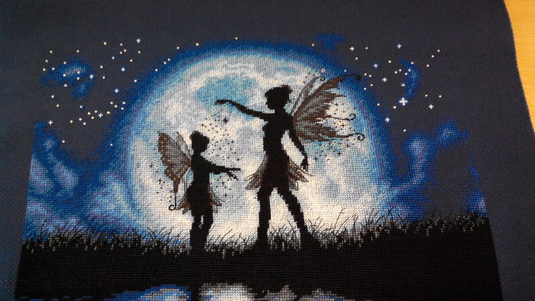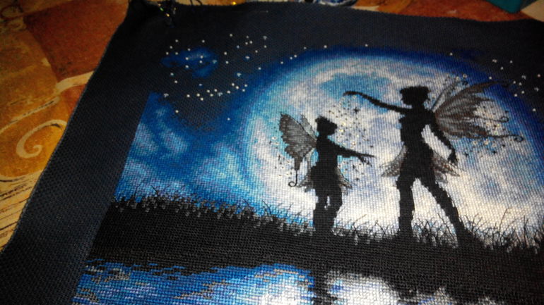 Покажу отшив без оформления. Отнесла в багетку, жду и волнуюсь за результат оформления. Багет выбирала очень долго. Ничего не подходило идеально. В конце недели заберу и покажу вам. Итак, картина шилась по набору ДИМ "Сумеречные силуэты", от себя я я добавила светящиеся в темноте нитки и надпись на отблеске луны на воде. И в результате - Звезды на небе светятся в темноте , светится звездная пыль, которой посыпают маленькую феечку, светится отблеск на воде - в темноте всплывает имя племяшки английскими буквами - GLORIA.