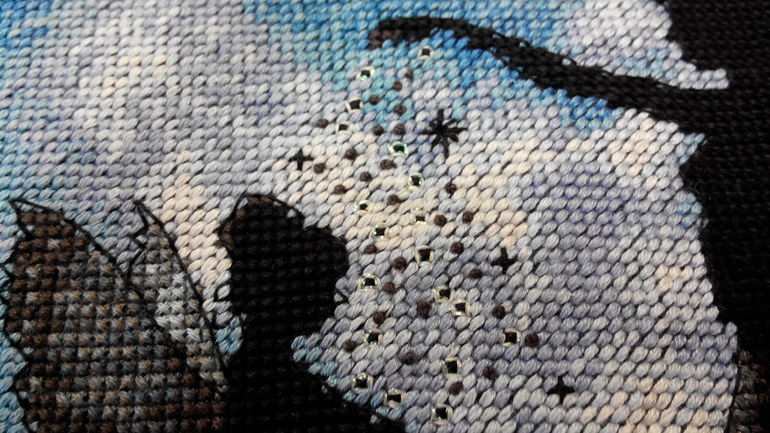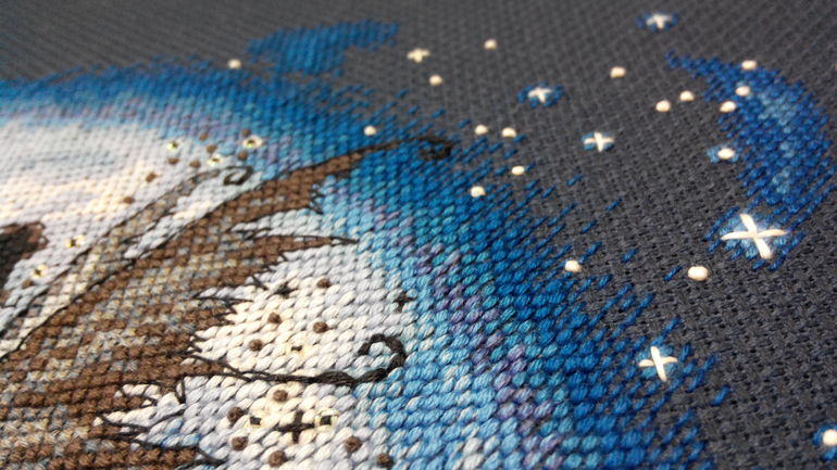 Работа не сложная: крест, полукрест в две, три, четыре , пять нитей, французские узелки, много бэка, в том числе серебристыми нитями, ну и отсебятина - светящиеся нитки.