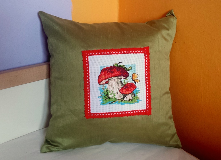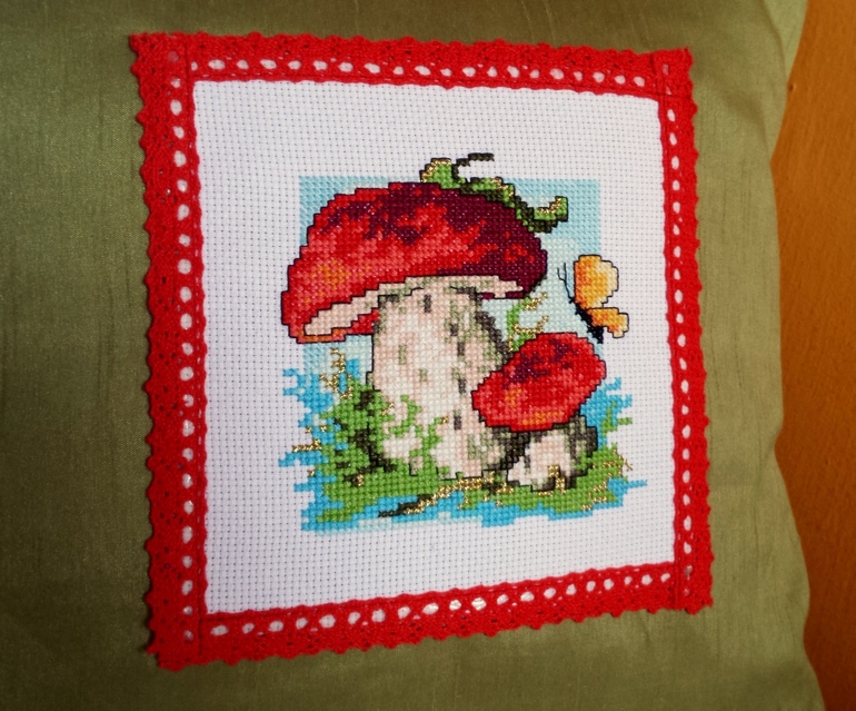 А неделю назад нас позвали на день рождения к одной 4-летней девочке. И идея подарка родилась сразу - что это будет подушка именно с этим сюжетом, у меня не было сомнений. Когда я стала подбирать ткань для наволочки, то перерыла все свои немаленькие запасы, но ничего ни в какую с этими грибами уживаться не хотело. Я уже было собралась отправляться в магазин на поиски ткани, как решила залезть еще в один закуток за флизелином, и наткнулась на эту наволочку. Приложила и... все заиграло. Этот ненавязчивый чуть золотистый блеск наволочки замечательно подошел к этой, казалось бы, совсем не подходящей по стилю картинке, потому что там тоже есть немножко золотой нити, которая там тоже не совсем в тему, как мне кажется. А вместе вон оно как получилось... )))) Ну а кружева из запасов окончательно связали все вместе.