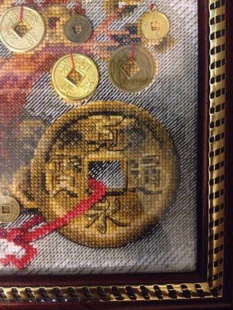 Вышивка крестомВышилось и оформилось в простую рамку самостоятельно. Набор очень понравился, ниточек очень много еще осталось, даже монетки с запасом. Первый раз вышивала набор этой фирмы, осталась довольна всем. Крест в 3 и 2 нити, полукрест, бэк и монетки. По схеме монетки пришиваются другими ниточками, но согласно приметам, монетки должны быть пришиты красными ниточками, так и сделала!