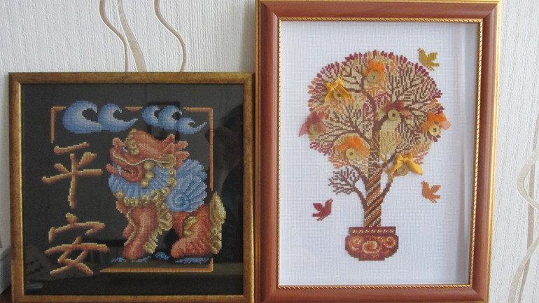 Вторая Риолис "Денежное дерево) подбором, монетки прям как в наборе не нашла, крестики шерстью ( обожаю) и бисер.