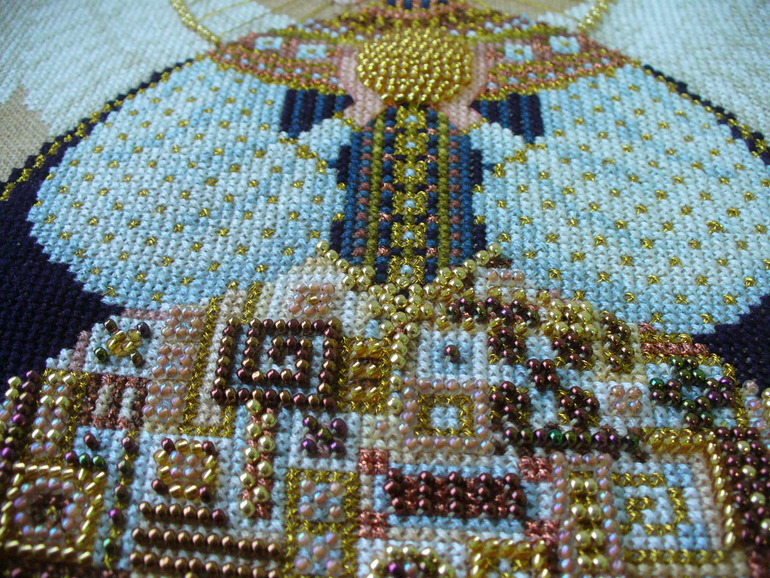 Все материалы были куплены по ключу схемы: лён 28 каунта,мулине DMC, Gold metallic тоже от DMC (катушечка 40 метров вся ушла в работу), крейник 2 вида, один используется в бленде и бисер Mill Hill.