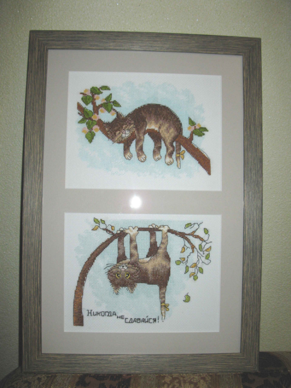 Их в природе три, первые две-те что показаны, и есть еще, когда кот уже на земле лежит, и названия у них Не будите, Помогите, Поднимите. Я как раз первую из них начала.