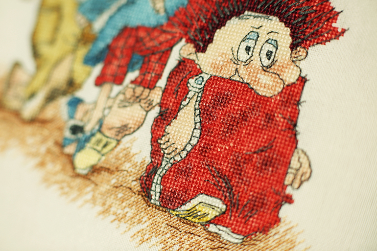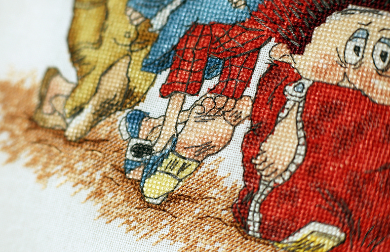 Работа предполагалась с фоном. Т.е. также как на родной обложке, с дорожкой, травкой и небом. И окончательный вариант схемы выглядел вот так. Но что-то меня все равно смущало, не нравились цвета в программе, хотя живые нитки были яркие. Меня этот нюанс настолько напрягал, что я решила в итоге вообще обойтись без фона. Чтоб ребята не висели в воздухе, я сделала дорожку. Мне настолько надоело вносить правки в схему, что тропинку я шила уже не по схеме, а просто на глаз.