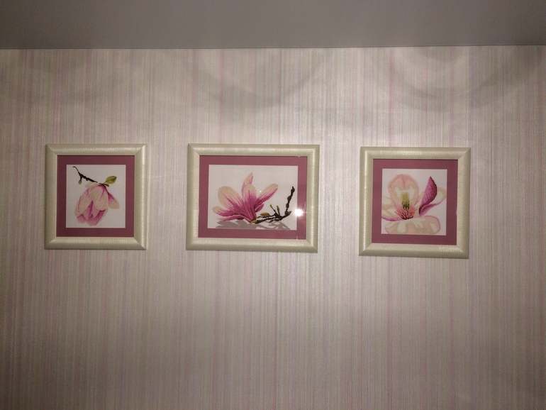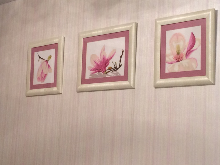 Вышивка крестомВышивала подбором по схеме из инета нитками ДМС, основа Линда 27. Сколько цветов уже не помню, есть бленды, крест в две нити, никакого полукреста, бэка и прочего. Очень нежная работа, легкая и приятная в отшиве. Вышивались в 2015 году, но оформить смогла только в феврале 2016. Оформлять решила отдельными картинами.