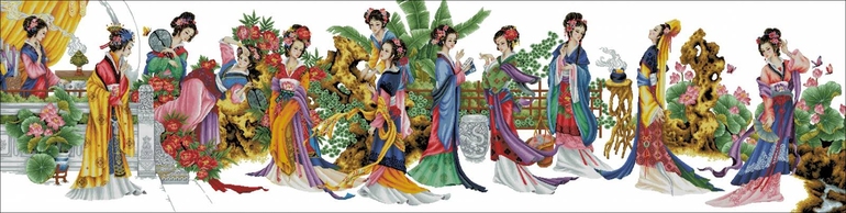 Покажу Вам свою хочушку №1 на данный момент- это "Двенадцать красавиц" от Dome . Она может посоревноваться по масштабности и сложности с деревенькой. Вот желание вышить есть, а вешать такую картину никуда не хочу. Скорее всего это так и останется мечтой.