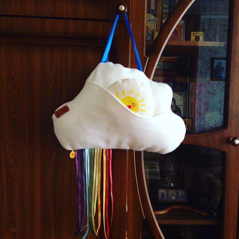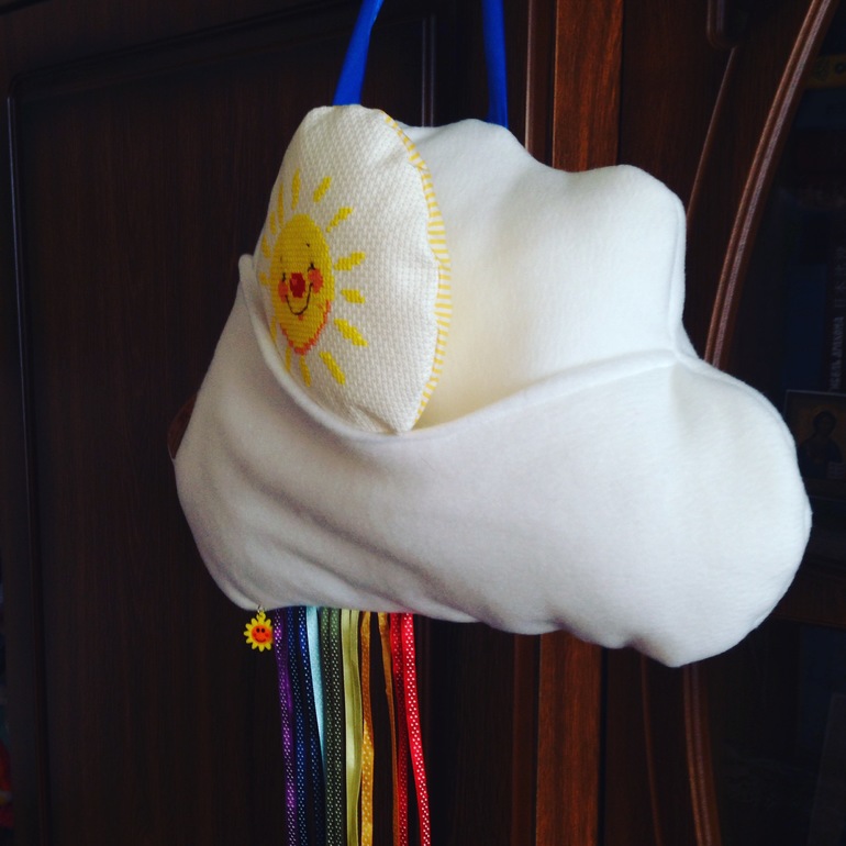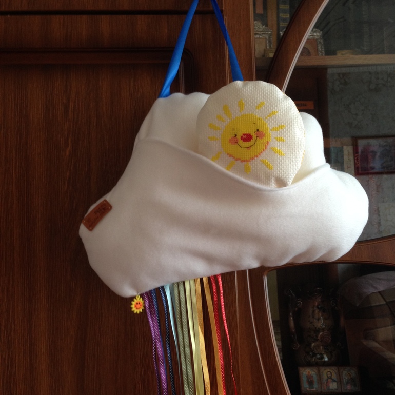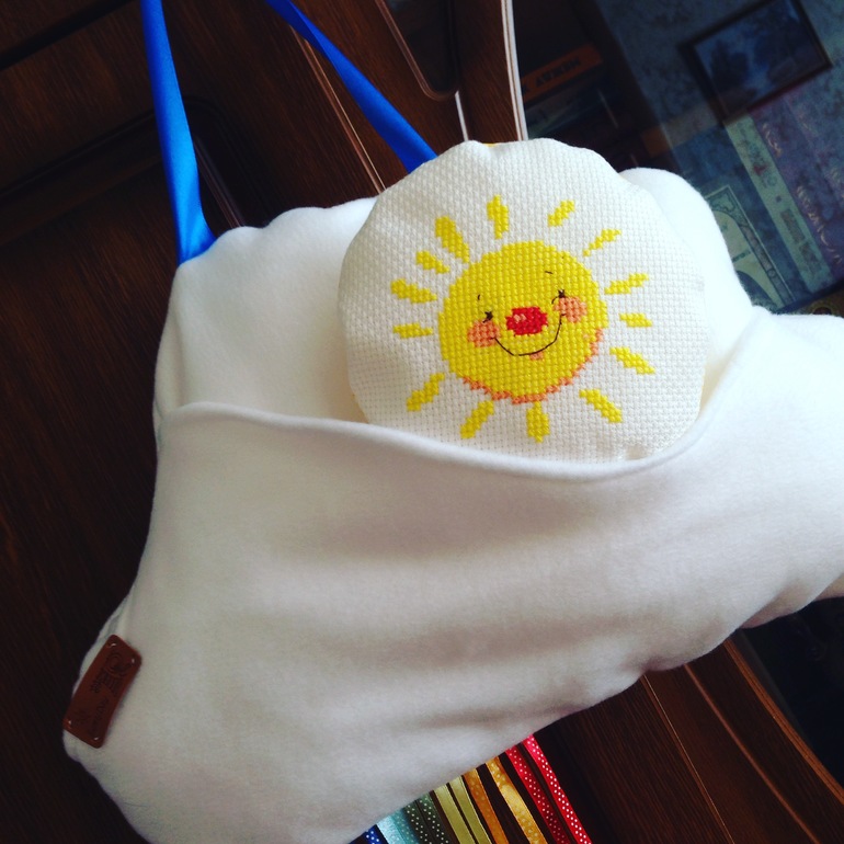 Вышивка крестомЕщё раз я к вам;) у меня то пусто, то густо)))) девочки в прошлом отчёте ВД видели моё солнышко. Учавствовала я в игре "Рукодельный крокодил". Слово отгадано) поэтому могу я выложить отчёт)! Подушка сшита из белого флиса, из ленточек получилась радуга, ручка символизирует небо) солнышко вышито! Можно вкладывать его в кармашек и оно визуально заходит за облако)))) возможно бред) не знаю))))