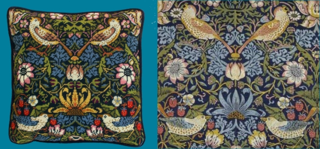 Оказывается эта подушка является очень даже неплохой интерпретацией рисунка "Клубничный воришка" (Strawberry Thief), созданного английским художником Уильямом Моррисом еще в 1883 году. В основу сюжета легли неугомонные птички, постоянно ворующие ягоды из сада художника