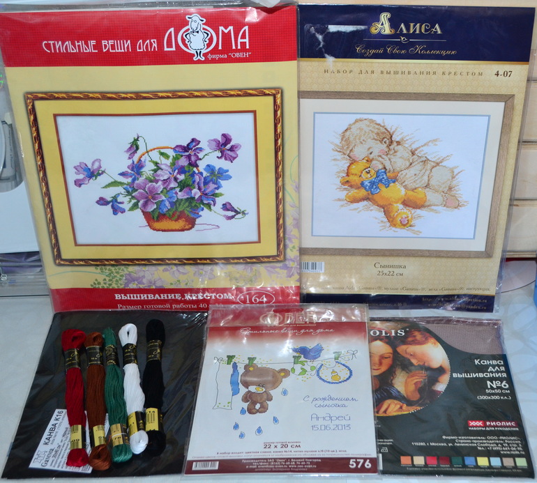 "Фиалки" и "Сынишка" новые наборы, "Метрика" чистая схема с остатками ниточек. Канва Гамма 30*40 черная 16 и канва Риолис 50*50 бледно-сливового цвета, ниточки кировские новый выпуск 10м. Магнит и сладкий подарок с меня причитаются.