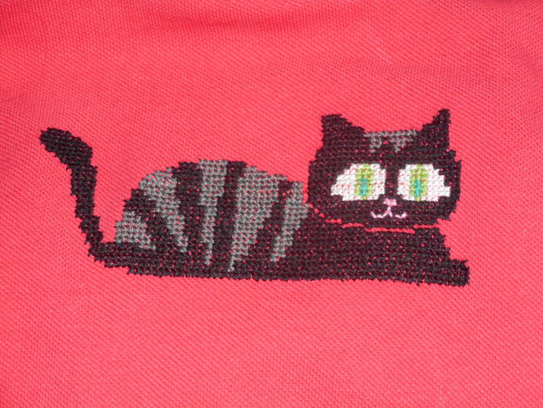 А это уже "После...". Впервые вышивала на водорастворимой канве. Тяжеловато пришлось, т.к. ещё и шов после зашивания дырки получился весьма выпуклый. Схему взяла из "Вышиваю крестиком" - дочь очень любит котов и этот похож на нашего. Усы делать не стала - побоялась, обтрепятся. Хочу ещё с обратной стороны укрепить вышивку флизелином.