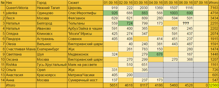 Всем привет. Хотела напоследок взять быка за рога, но тут неожиданно привалила работа... А денежки нужны... И я продалась в рабство, променяв мою любимую вышивку)) У меня 190 крестиков и 6 % = 201. Но что я поняла для себя: можно взять себя в руки и вполне не напрягаясь вышивать 500 крестиков в день, и может быть будут наборчики вышиваться, а на копится долгострои. Спасибо за совместник и за компанию. Может если бы я попробовала летом, когда было больше времени, то у меня была бы золотая медаль))