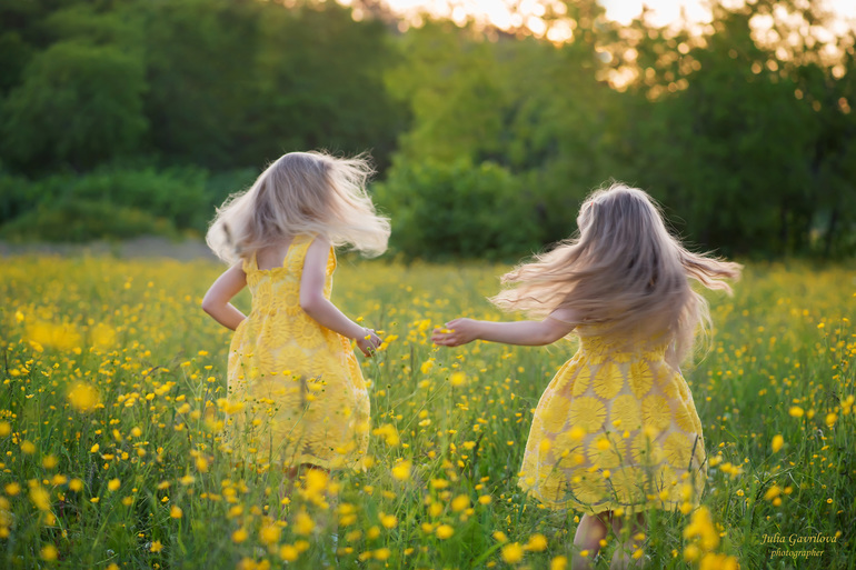 У нас девочки в осенних платьях. Я дочкам желтые платья шила еще летом, для фото в лютиках. Мы с детьми сделали отпечатки краской листиками, вырезали их. Я пришла к платье и сделала веночек из цветов. В следующий раз покажу фоточку. А платья вот эти