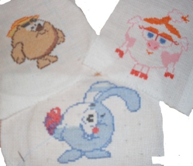 1. Это вышивала в подарок для маленькой девочки персонажей из "Смешариков". Девочка в них влюблена просто.))) Мелочь конечно, но все же.=)