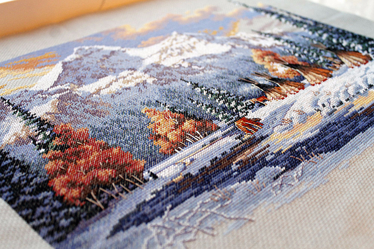 Вышивался набор ровно месяц в рамках осеннего конкурса. Без напрягов, потому что почти вся работа вышивается полукрестом, кроме лошадок, домиков индейцев и самих индейцев) Надо быть внимательным где вышивка в 2 нитки, а где - в 3. Я ошиблась и потом всю реку пришлось дошивать поверх 2 еще и третьей ниткой. Бэка очень мало - домики, люди и стволы деревьев. Ну и травка. Горы и небо вышивались особенно приятно - такие цвета чудесные, и такое чувство что и дышится легко как у подножья гор, как поздней осенью))