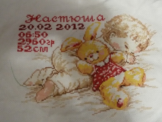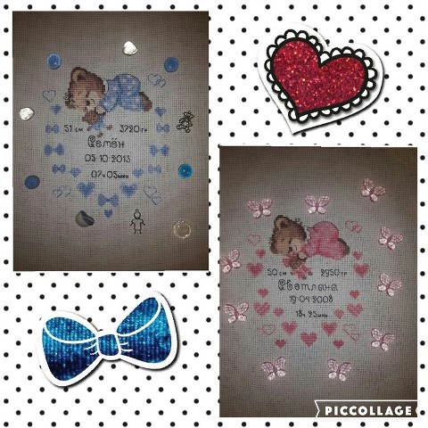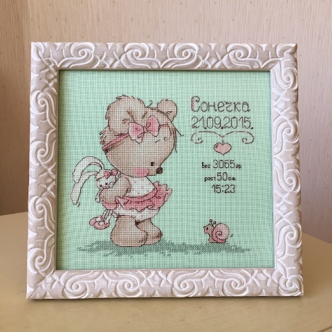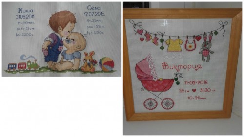 успела вышить в рамках нашего проекта две прекрасных работы для сразу троих малышей! Первая уже даже получила своё оформление, творчески украшенное дополнительными декоративными элементами:
