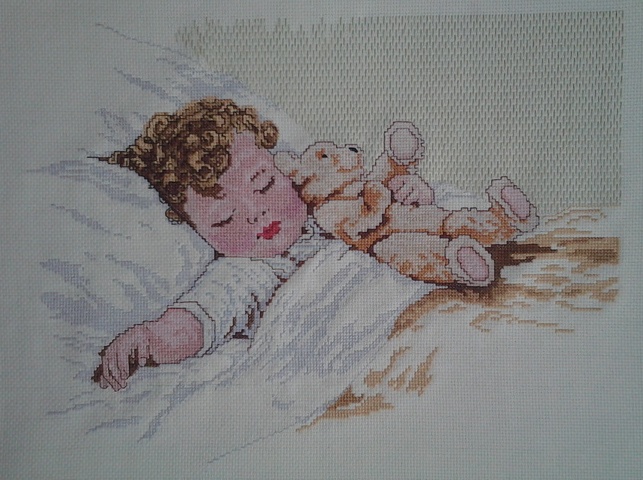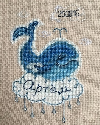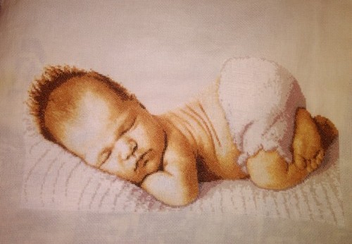 оказался, пожалуй, самым непростым: первый подбор ниток был неудачным, и мастерица была вынуждена переделывать уже вышитого малыша заново. Зато это была первая завершенная работа в совместнике!