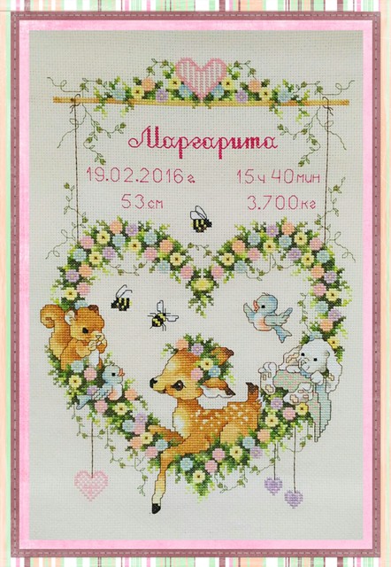 вышила целые две прекрасные метрики. На своем примере она показала, что при умелом подходе из любого детского сюжета можно сделать именную вышивку, а при мастерском исполнении и оформлении даже самая небольшая работа может стать прекрасным образчиком вышивального искусства: