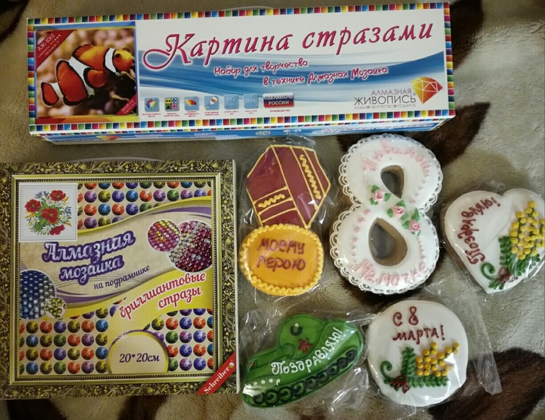А тут прянички на подарки к 23 февраля и 8 марта, и две картинки. Рыбка это для ребенка, т.к. ему понравилось, как я собираю, захотелось самому, а маки мне, ну или подарю коллеге на ДР)))