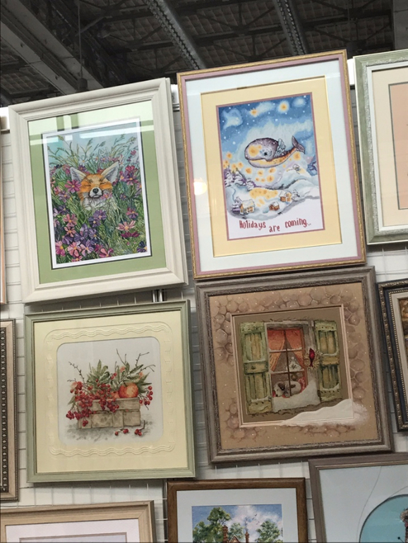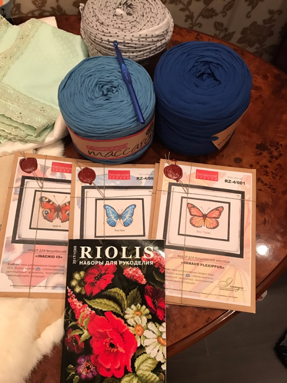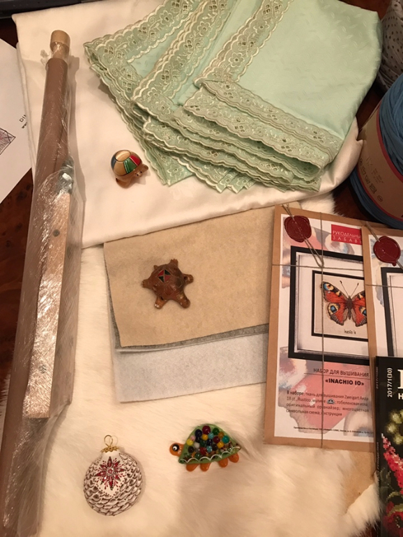 Ну а это мои сокровища: маленькая, но длинная рамка, скатерть с салфетками (пленила цена), мех и фетр для моих произведений, елочные шарик с дырочками и росписью, три черепашки в мою коллекцию. Пряжа из трикотажа для моей идеи с ковриком), и бабочки.