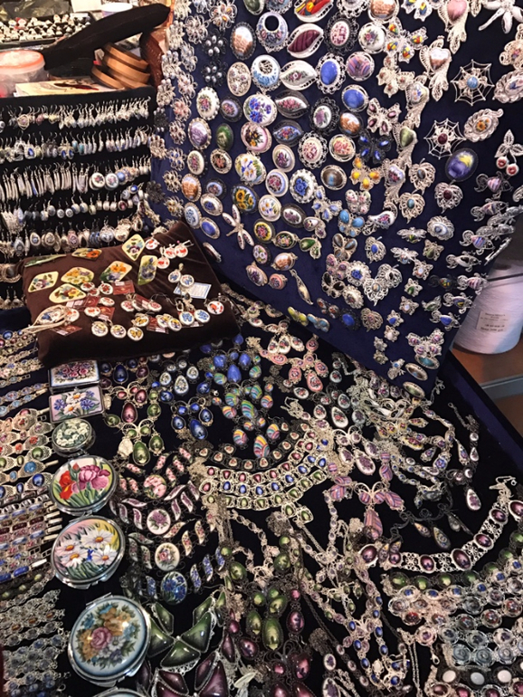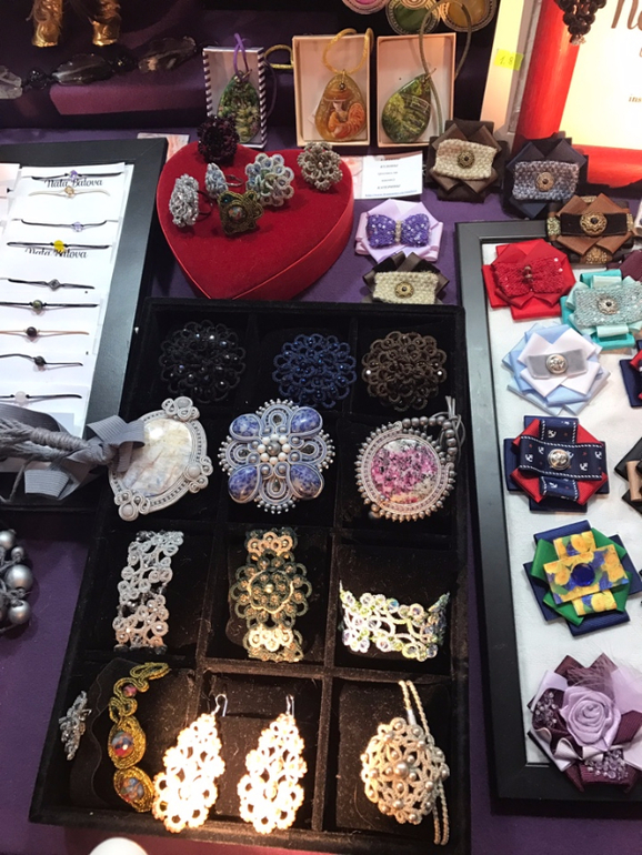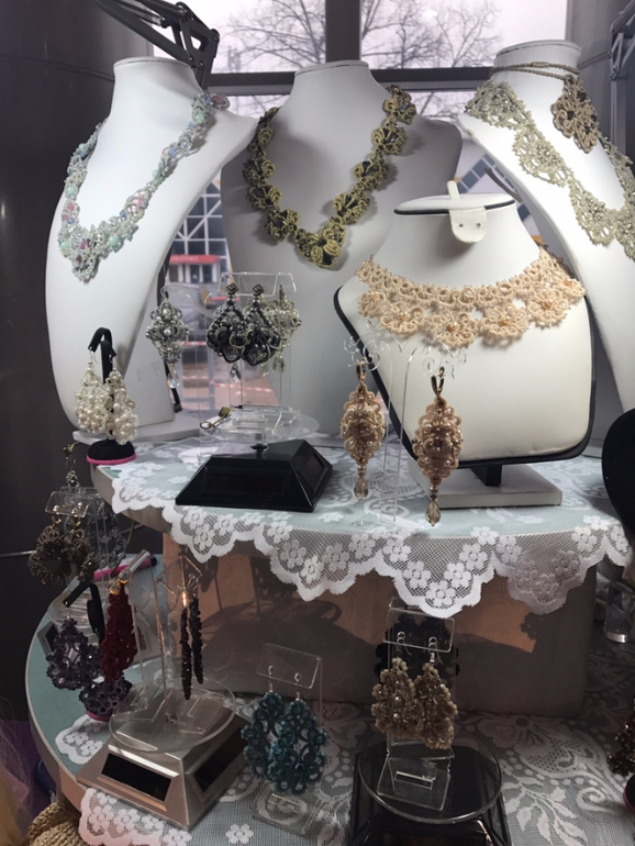 Это макраме на коклюшках - так мне объяснили. То есть серьги не вязаные, а плетеные на коклюшках, и сверху расшитые буснами. Нижний ряд - 8000 р., верхний 12 ))) Серьги огромные, но невесомые. Я за такие деньжищи даже в руки побоялась брать)