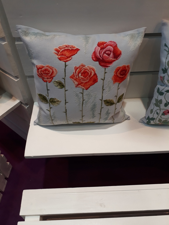 А вот подушка с розой - просто красотка. Красные и розовые оттенки на сером фоне сморятся очень эффектно