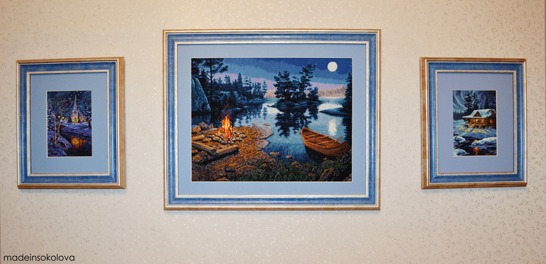 Вышивка крестомРешила три картины оформить в едином стили) Висят в комнате, где стоит синий диван и висят синие шторы.