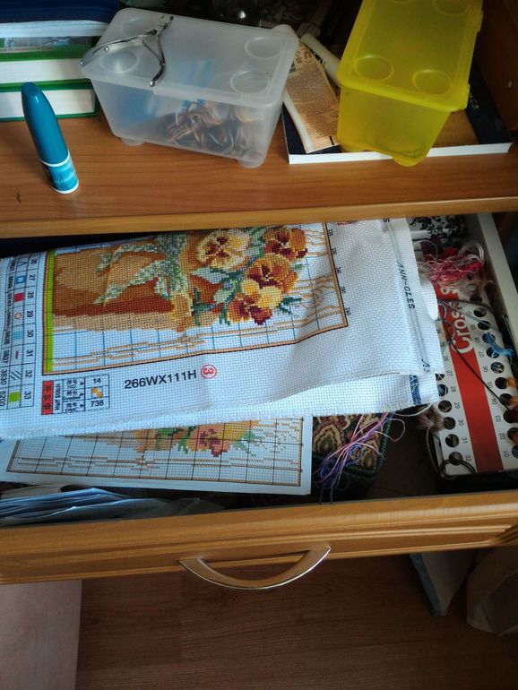 у меня коробка, в ней лежат схемы, которые ждут своей очереди , не распакованные еще. Те, которые в работе (обычно это 1-2), в матерчатых сумках, вместе с пяльцами, органайзерами, бобинками и прочим. Места именно рабочего тоже нет, а так хочется уюта. из за этого и не вышивается толком. Если будем в этом году делать ремонт, обустрою себе уголочек