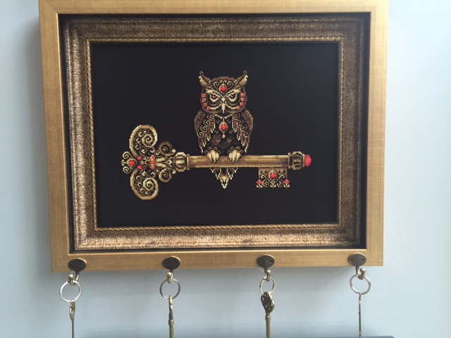 ключницы еще нет, очень дорого в багетке ту, как я хочу (хочу закрытую, как коробка, а не просто крючки внизу). Уже подумываю купить готовую ключницу в виде коробки под размер вышивки и самой туда как то натянуть