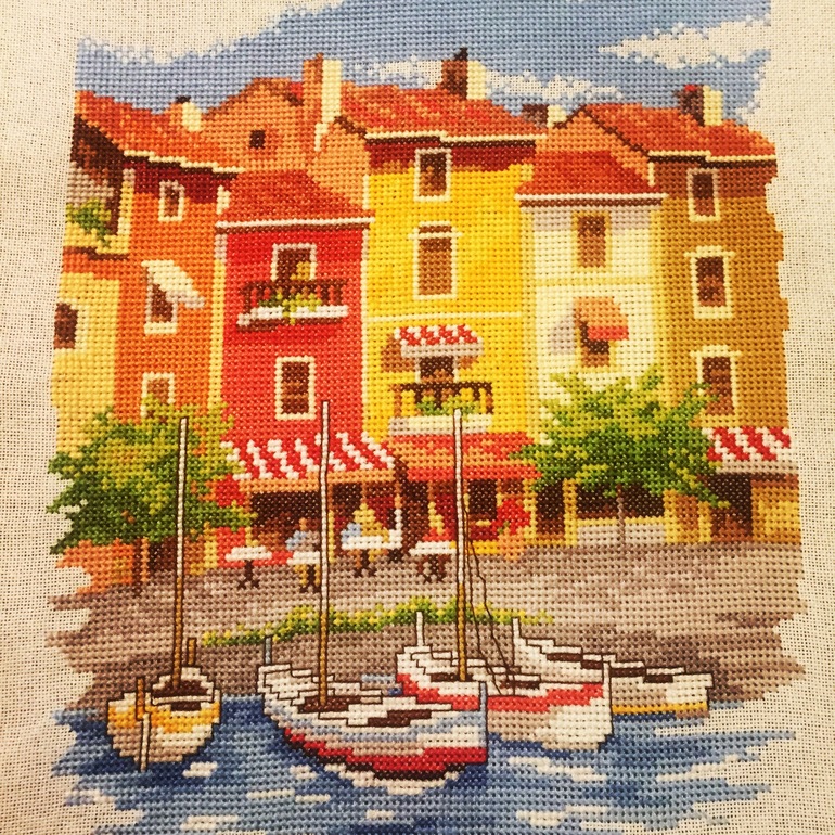 Вышивка крестомЕсть такой небольшой городок на юге Италии Портофино. Наверно там такие же цвета:-))) Солнышко, голубая водичка, цветные домики и неторопливая жизнь.... именно этого и не хватает, особенно первого... солнышка)) Увидела эту картинку и просто влюбилась в цвета, яркие и насыщенные. Начинала вышивать в жуткую серую погоду, поэтому эта вышивка стала для меня в своем роде антидепрессантом и цветотерапией. Вышила очень быстро, всего за месяц, схема из журнала Вышиваю крестиком, размер небольшой 20/25, основа Цвайгарт Бритни 28 к, нити DMC по ключу. Всем весны и солнышка! Пока не оформила, жду выходных и в багетку.... пока думаю, в каких цветах лучше оформить, может кто подскажет?:-)