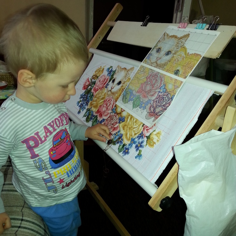 Будет у него подушка в кроватке с котятами. Пора уже бабуле отдать ее подушку с ирисами)