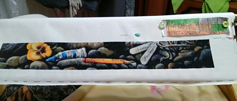 Фото только по частям, ширина рамы не позволяет сделать фотографию всего отшитого участка. Начала вышивать вторую полосу, отшила из нее один лист с травой.