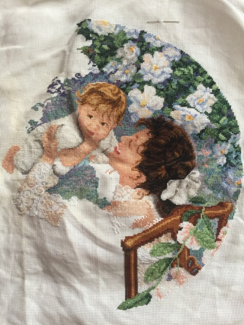 Ольга вышивала мамину радость от дименшенс с понятной для многих мечтой, мечтой о ребенке. Скорейшего завершения работы и исполнения мечты!