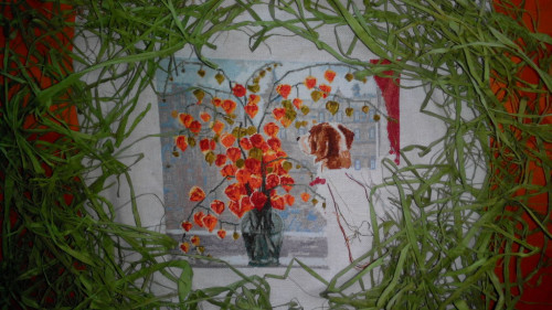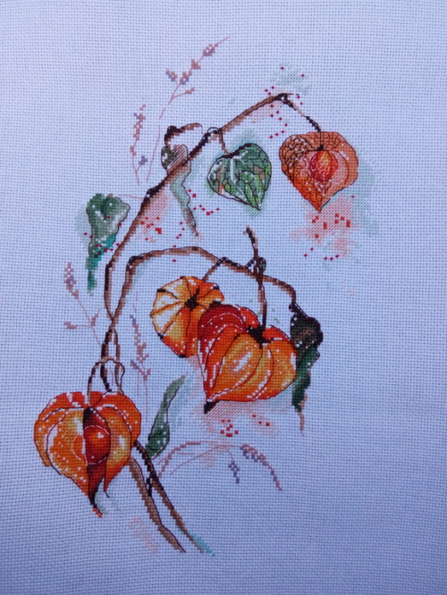 Ольга вышивала тоже физалис, но не ради беременности, а ради компании. но у нас был уговор что вышивка ей, а беременность мне. И тадам! По окончанию совместника я совершенно случайно подбираю щенка и узнаю что беременна))) можно сказать что примета сработала на 100%! За что спасибо Ольге и надеюсь что в скором времени она вышьет эту работу. к тому же это герой-она вышивает на равномерке через 1 нить!