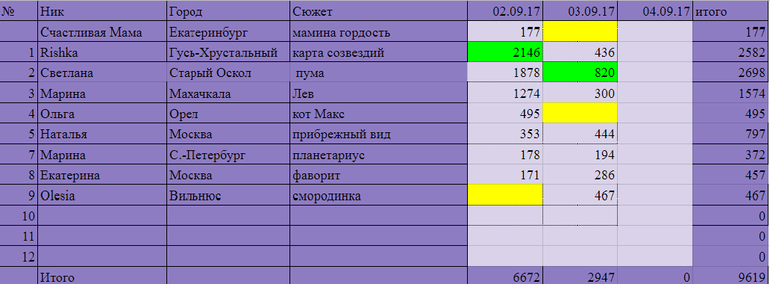 вообще ничего не могу делать...ну а Вы молодцы! Лидером дня стала Светлана 820 крестиков, а в общем мы навышивали 2947 крестиков...маловато, но понимаю что начались рабочие будни=)))
