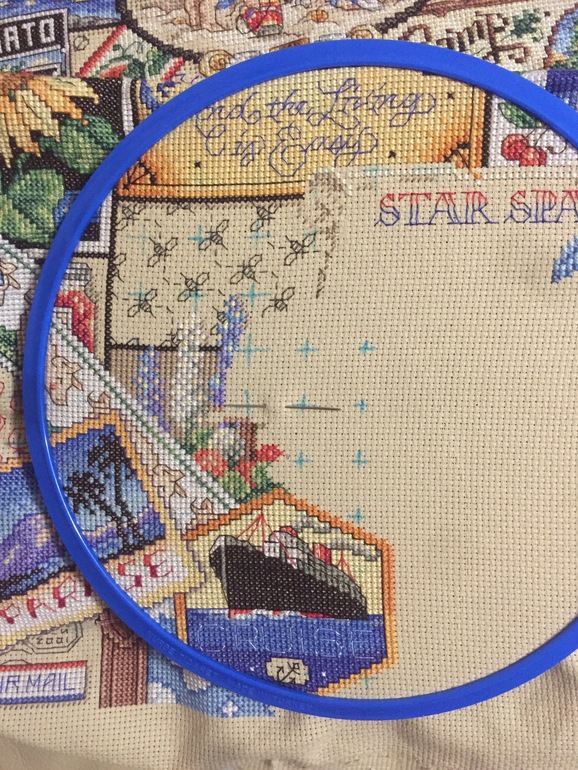 На этой неделе был один выходной и тот провела на природе. Поэтому я переставила вышивку на пяльца и вышивала по утрам и на работе.