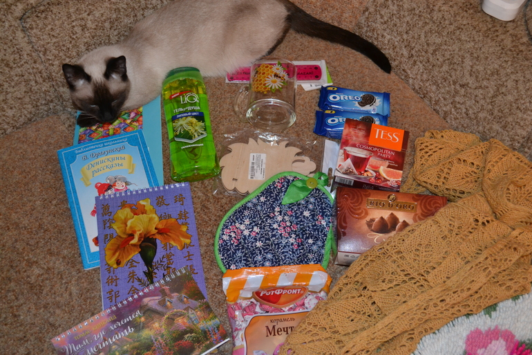 Я получила замечательный подарок, который я открывала и открывала)))) Покажу сначала общий вид наших подарочков. Правда, когда я раскладывала для фотосессии подарки, то у нашей Дейзи любопытство взяло верх и она оказалась в кадре)))