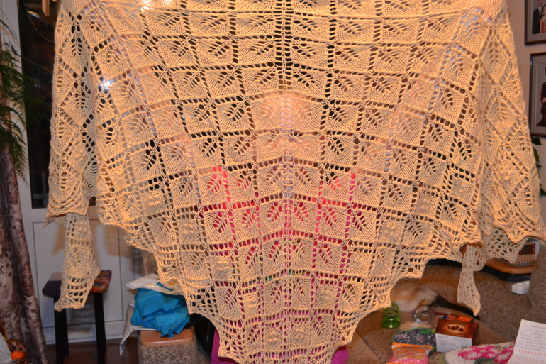 Затем хочу показать поближе одну из Рукоделок Кати - это косынка-шаль связанная спицами(!!!!). Я тоже спицами вяжу, но как сделать ТАКУЮ масштабную работу - ума не приложу!!!!