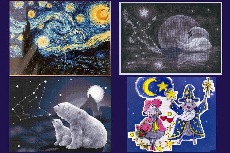 Начнем с того, что в вышивке просто уйма дизайнов со звёздами, созвездиями и планетами. Наверняка хотя бы раз они вам встречались, например: